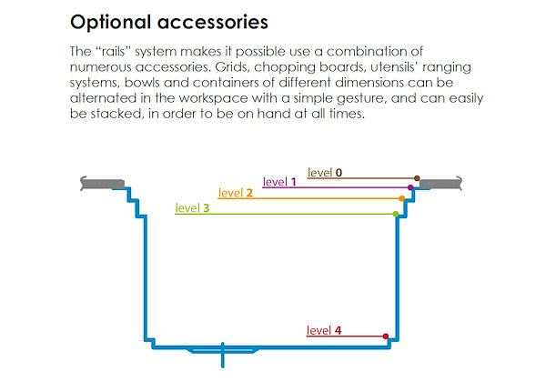 Triple recess - sliding accessoriesThe Foster Milano sink has an ingenious design that makes it simple to use a large set of optional accessories. On the topmost supporting step, the innovative Black grids slide, creating a large and practical surface to rinse food and crockery. The second step is meant to support and allow the... sliding of a complete combination of accessories, which make some operations practical and safe: rinse, drain, slice, grate… everything can be done inside the sink. The third supporting step is on the bottom of the bowl. On this step one can rest the Black grids, making it possible to rinse foodstuffs without their coming in contact with the bottom of the sink, which may be dirty.